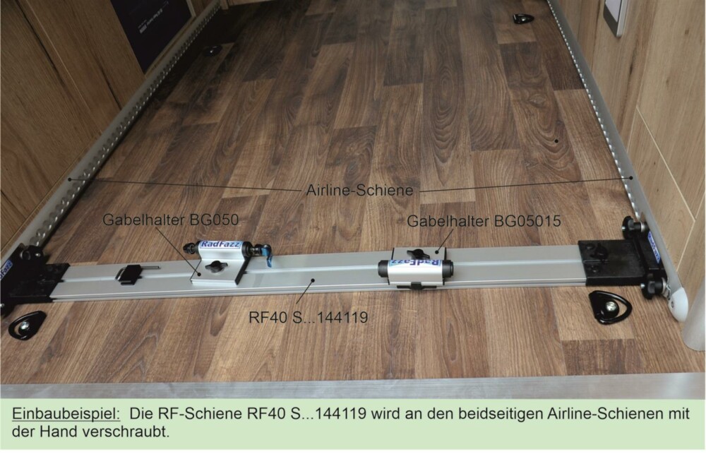 Die gewählte RF-Schiene befestigen Sie an die Zurrschienen P15 in der Wohnmobilgarage https://www.radfazz.de/Befestigungspunkte