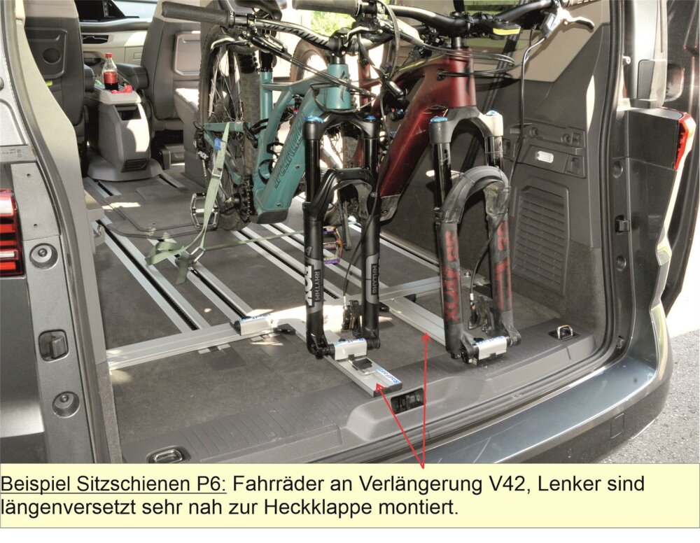 Die Zurrösen sind an den Sitzschienen im Ford Tourneo Custom ab Bj. 2024, Multivan T7 und California T7 zu montieren. 2x Zurrösen plus Gurt werden zur Fahrradsicherung verwendet.