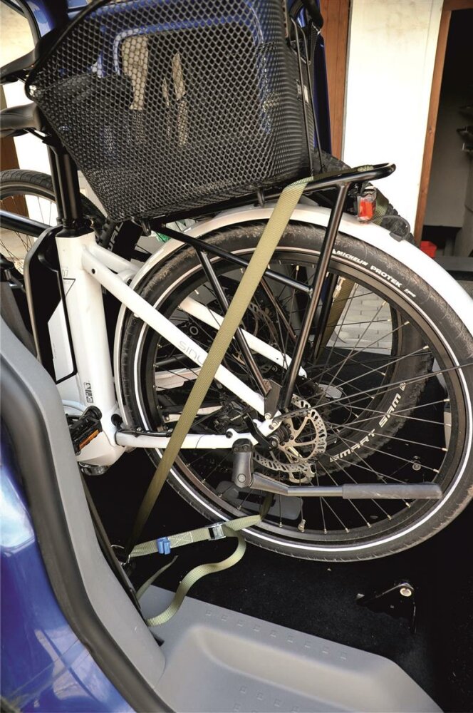Sicherheitshinweis! Den Hinterbau vom Fahrrad sichern Sie immer mit den beiliegenden Gurt.